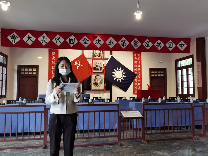 镜头切换,学习小组一行来到中国共产党第五次全国代表大会会址纪念馆,研究生第一党支部纪检委员马贝贝拿出早已备好的稿件,讲解了中国共产党第五次全国代表大会召开的时代背景、目的和内容,大会通过了一系列重要的决议案,强调了无产阶级在革命中夺取领导权、建立革命政权开展土地革命等,毛泽东等当选为中央委员或候补中央委员。随后,党员们参观了96名参会代表的生平和简介。看完后,党员们相互激励,要以他们为榜样,永葆党员的先进性。